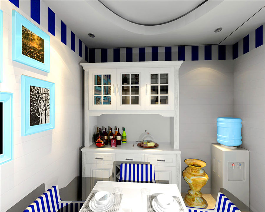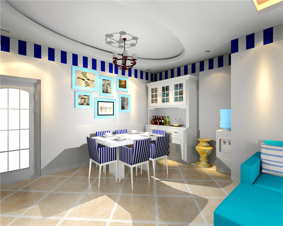 就整體布局來看,視覺上十分寬闊,顯得比較有格局。色彩搭配的話,純白色與深藍(lán)色的撞擊,不會(huì)顯得很突兀,反而給人一種眼前一亮的感覺。朱紅色與白色相間的吊燈造型,讓整體氛圍更加貼近自然。